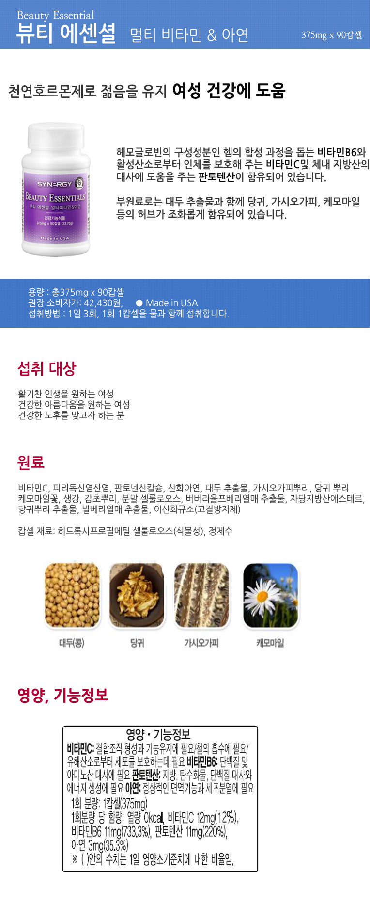 멀티비타민&아연, 건강한 아름다움을 원하는 여성, 건강한 노후를 맞고자 하는 분, 비타민B6, 비타민C, 판토텐산이 함유되어 있습니다. 1일 3회, 1회 1캅셀 섭취.