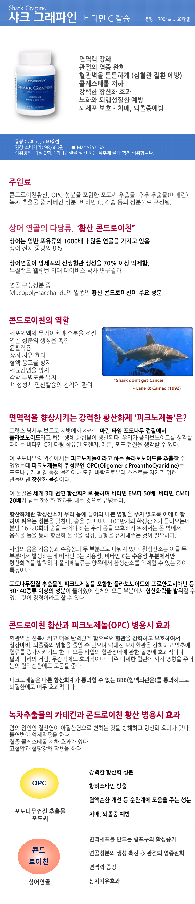 패각분말(소성), 비타민C, 상어연골분말, 포도씨추출물, 결정셀룰로오스, 스테아린산마그네슘, 후추추출물, 녹차잎추출물. 칼슘, 비타민C의 보충이 필요한 분,1일 2회, 1회 1캅셀을 식전 또는 식후에 섭취합니다.